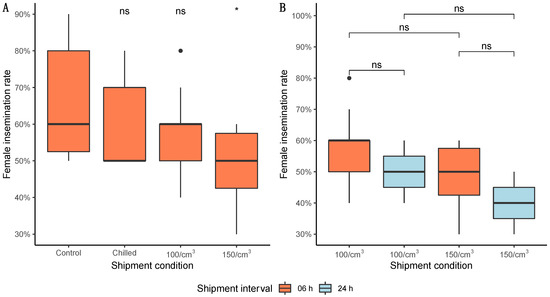 Mean insemination rate Aedes aegypti females after mating with males exposed to different shipment conditions: (A) shipment period of 6 h with comparisons always using the control group as reference; (B) comparison of 6 and 24 h for both densities (N = 80 females/group; 8 males/group, 240 spermathecae/group). Significance values goes as ‘*’ < 0.05, ‘ns’ < 0.1. Black dots correspond to potential outliers among the samples.