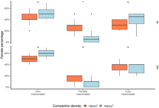 Insemination level of Aedes aegypti females after mating with exposed males at two different compaction densities and two shipment periods (N = 80 females/group; 8 males/group) (Wilcoxon–Mann–Whitney, p < 0.05). Significance values goes as ‘**’ < 0.01, ‘ns’ < 0.1. Black dots correspond to potential outliers among the samples.
