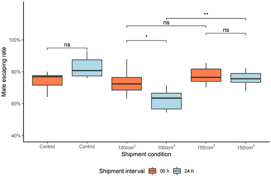 The escape rate results indicated no statistical significance among all groups exposed to 6 h shipment interval at 10 °C (Kruskal–Wallis = 1.415; df = 2; p = 0.493—Figure 6A). In detail, males compacted in both densities, with a shipment interval of 6 h, had no significant impact compared to the control group (Wilcoxon–Mann–Whitney = 12; p = 0.394, Figure 6). Meanwhile, the 24 h interval showed a difference among all groups (Kruskal–Wallis = 12.29; df = 2; p < 0.05), this difference is also significant between the two tested densities (Wilcoxon–Mann–Whitney = 1; p < 0.05, Figure 6). However, males compacted at a density of 100 males/cm3 for 24 h had a significantly lower escape rate than untreated males and compacted males at 150 males/cm3 (Wilcoxon–Mann–Whitney = 36; p < 0.05, Figure 6). Moreover, the mosquito escape rate showed a statistical difference between the two shipment periods compacted at 100 males/cm3 density (Wilcoxon–Mann–Whitney = 31; p = 0.041, Figure 6), which males packed for 24 h had a lower escape rate. It is worth mentioning that the escape rate using 150 males/cm3 density had no significant difference between both simulated shipments (6 and 24 h) (Wilcoxon–Mann–Whitney = 22; p = 0.589, Figure 6).