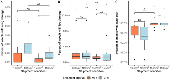 Physical damage after compaction (100 and 150 males/cm3) and shipment interval (06 and 24 h) at 10 °C: (A) wing damage; (B) leg damage; (C) scale loss. Significant differences between treatment groups are indicated by the p-value level. The boxplot shows the median and upper and lower quartiles. Significance values goes as ‘**’ < 0.01, ‘*’ < 0.05, ‘ns’ < 0.1. Black dots correspond to potential outliers among the samples.