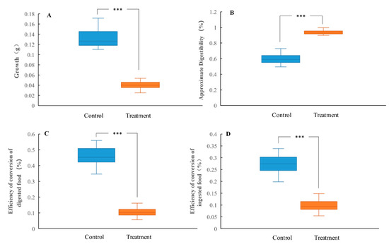 All the parameters of the control and treatment groups were analyzed and compared by an independent sample t-test with α = 0.05 as the significance level. The functions of microflora were predicted using PICRUSt2, and the relative abundances of gut microflora with the same functions between the control/treatment groups were compared by an independent sample t-test [42]. Based on the above physiological indexes and gut microflora data, Pearson’s correlation analysis was performed to determine the correlation between gut microorganisms at the genus level and the physiological parameters in tannic acid-treated larvae.