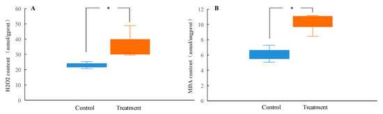 The 6th instar larvae aged less than 24 h were dissected, and the excised midgut tissues were homogenized in pre-chilled saline. After centrifuging at 10,000× g (4 °C) for 10 min, the supernatants were collected and the levels of malondialdehyde (MDA) and hydrogen peroxide (H2O2) were detected using the corresponding kits (purchased from Nanjing Jiancheng Biology Co., Ltd., Nanjing, China). The assays were set in three repeats in each group, with five larvae per repeat. Briefly, H2O2 reacts with molybdic acid to form a complex, which can be spectrophotometrically detected at 405 nm. The H2O2 content was expressed in nmol/mg protein. MDA can react with thiobarbituric acid (TBA) to form a red product, which can be spectrophotometrically detected at 532 nm. The content of MDA was expressed in nmol/mg protein.