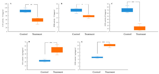 The 6th instar larvae aged less than 24 h were dissected, and the excised midgut tissues were homogenized in pre-chilled saline. After centrifuging at 3000× g (4 °C) for 10 min, the supernatants were collected and the activities or contents of CAT, POD, GSTs, ASA, and GSH were detected using the corresponding kits (purchased from Nanjing Jiancheng Biology Co., Ltd. (Nanjing, China)). A total of three repeats in each group were set, with five larvae per repeat. Specifically, CAT activity was detected by the ammonium molybdate method at 405 nm and expressed in U/mg protein. POD can catalyze H2O2, and its activity can be obtained by measuring the change in absorbance at 420 nm. The activity of POD was expressed in U/mg protein. GSTs can catalyze the binding of reduced glutathione (GSH) to the CDNB substrate. In the reaction system, the reduction of GSH by 1 μmol/L was a unit of enzyme activity, which could be detected at 412 nm. The GST activity was expressed in U/mg protein. ASA can react with Fe3+ to form Fe2+, which can further react with phenanthroline, resulting in color production. The reaction could be detected at 536 nm, and the content of ASA was expressed in μg/mg protein. The thio compounds in GSH can react with dithiodinitrobenzoic acid (DTNB), resulting in the formation of yellow compounds, which can be detected at 420 nm. The content of GSH was expressed in μg/mg protein. The protein content was determined by Coomassie brilliant blue staining at 595 nm.