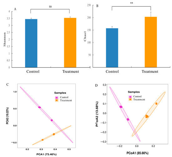 The gut microbial diversity in the H. cunea larvae at the 6th instar after rearing on untreated or tannic acid-treated diets (n = 4). (A) Chao1 index. (B) Shannon index. (C) Principal components analysis (PCA). (D) PCoA plot of the gut microbiota structures based on the unweighted UniFrac analysis. Asterisk indicates significant differences between control/treatment groups (independent samples t-test; **, p < 0.01).