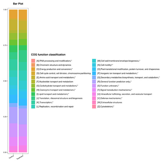 To study the effect of tannic acid treatment on the functions of the gut microbiota, BLAST was used to predict the functions of the sequences by searching against the COG database. A total of 24 functional categories were annotated (Figure 5). Tannic acid exposure resulted in a significant upregulation of one functional category, namely, cell motility (p < 0.05). However, 14 functional categories, including RNA processing and modification; energy production and conversion; amino acid transport and metabolism; carbohydrate transport and metabolism; coenzyme transport and metabolism; lipid transport and metabolism; transcription; cell wall/membrane/envelope biogenesis; inorganic ion transport and metabolism; secondary metabolites biosynthesis, transport, and catabolism; general function prediction only; function unknown; signal transduction mechanisms; defense mechanisms; and cytoskeleton (p < 0.05), were significantly downregulated in the treatment group.