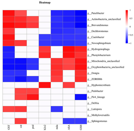 To determine whether the gut microbes could affect the physiological state of the larval intestine, we analyzed the correlation between gut microflora at the genus level and the physiological parameters (Figure 6). Based on the Pearson correlation analysis, the differential gut microflora of the larvae could be divided into three types according to their correlations with biochemical parameters. The first type was positively correlated with antioxidant enzymes and detoxifying enzymes but negatively correlated with the non-enzymatic antioxidants and ROS content and was mainly composed of the following genera: Patulibacter, Actinobacteria_unclassified, Brevundimonas, Caulobacter, and Novosphingobium. In contrast, the second type was positively correlated with the non-enzymatic antioxidants and ROS levels but negatively correlated with antioxidant enzymes and detoxifying enzymes and mainly comprised the Hydrogenophaga, Phenylobacterium, Mitochondria_unclassified, Oxyphotobacteria_unclassified, Dongia, and ZOR0006 genera. The third type consisted of the remaining seven genera that only showed correlations with a few physiological indexes.