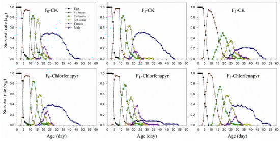 Age-stage-specific survival rate (sxj) of P. marginatus (F0, F1, and F3) exposed to LC30 of chlorfenapyr. CK represents the control.