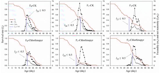 The age-specific survival rates (lx) of P. marginatus after different treatments are shown in Figure 2. The 50% survival rate of P. marginatus in the chlorfenapyr treatment groups occurred at ages 26, 24, and 32 d in the F0, F1, and F3 generations, respectively, and at ages 26, 30, and 27 d in F0, F1, and F3 of the control. Higher age-specific fecundity (mx) and net maternity (lxmx) curves were observed in the F1 of the control. Although the mx had a higher peak in the control (53.46 at 35 d) in the F3, the lx and lxmx values were lower than those in the chlorfenapyr treatment.
