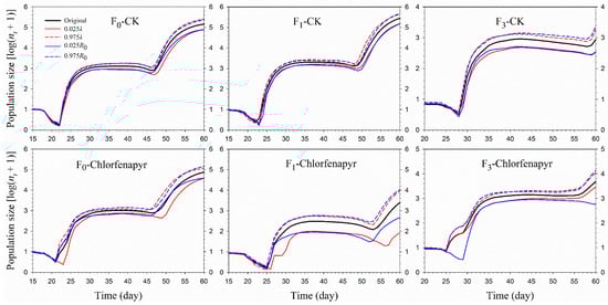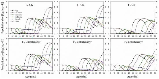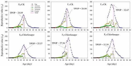 The age-stage-specific reproductive value (vxj) represents the contribution to future offspring of an individual from age x to stage j (Figure 3). The vxj value of the F0, F1, and F3 generations at age zero is a finite rate of increase (λ), i.e., 1.178, 1.114, and 1.157 in the chlorfenapyr treatment and 1.193, 1.202, and 1.140, respectively, in the control. The vxj value increased with age, with the vxj curve significantly increasing when the female adults emerged. In general, the maximum vxj values in different stages in the control were higher than those in the chlorfenapyr-treated group. The vxj peaks were close to the TPOP.