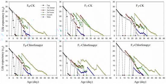 Age-stage-specific life expectancy (exj) of P. marginatus (F0, F1, and F3) exposed to LC30 dose of chlorfenapyr. CK represents the control.