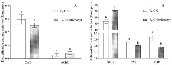 Effects of chlorfenapyr on detoxification enzyme (A) and antioxidative enzyme (B) activities of P. marginatus (F0-Chlorfenapyr) and F0-CK. Data are means ± SE of three biological replications; different letters above each bar indicate statistically significant difference by t-test (p < 0.05). CK represents the control, AchE is acetylcholinesterase, CarE is carboxylesterase, SOD is superoxide dismutase, CAT is catalase, and POD is peroxidase.