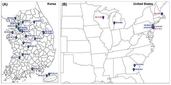 Sampling collection sites of Dasineura oxycoccana. (A) South Korea. (B) USA. Detailed information of locations is described in Supplementary Materials Table S1.