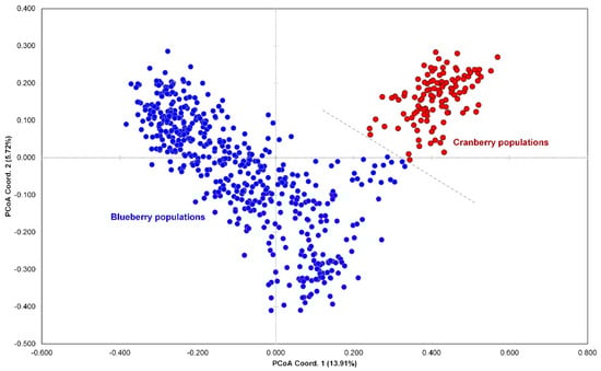 To test for genetic associations among the 31 D. oxycoccana populations, principal coordinate analysis (PCoA) was used by calculating the genetic distance matrix with codominant genotypic distance [,] implemented in GENALEX 6.503 []. The PCoA allows for the visualization of major patterns based on a multilocus genotype with multiple samples [,]. Plots in the PCoA were independently calculated and displayed by either individual- or population-level distances.