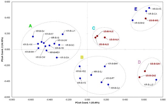 Principal coordinate analysis (PCoA) plotted using microsatellite data from 28 Dasineura oxycoccana blueberry populations from USA and Korea. The X-axis is coordinate 1, ranging from −0.80 to 0.80, and the Y-axis is coordinate 2, ranging from −0.60 to 0.60. Red circles correspond to the USA populations, and blue circles correspond to the Korean populations. Letters A–E represent genetically isolated subgroups.