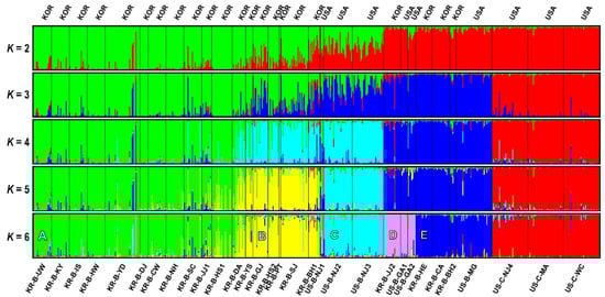 Bayesian clustering (STRUCTURE) for the 31 Dasineura oxycoccana populations collected from blueberry and cranberry in the USA and Korea. Individual assignment plots for K = 2, 3, 4, 5, and 6. Different colors indicate different clusters (e.g., A–E).
