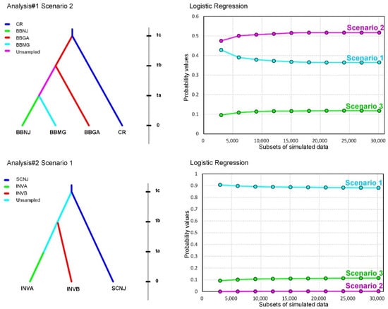 Scenarios (left panels) most supported by two independent analyses (Analysis #1 and Analysis #2), and probability values (right panels) from corresponding logistic regressions. Analysis #1 tested for serial divergence between Dasineura oxycoccana populations from blueberry and cranberry in the native range, whereas Analysis #2 tested for a divergence between a source (USA) of D. oxycoccana and the invaded region (Korea). Time (not to scale) is indicated on the right side of each scenario.