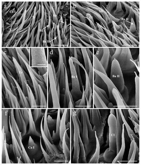 Basiconic sensilla (Ba) are digitiform, arise from conspicuously swollen bases, and abruptly taper into blunt tips, with cuticular walls pierced by distinct pores from base to top (Figure 2a,b,d,e). Two subtypes (Ba I, II) are summarized based on their shape and size (Table 1) in females. The basiconic sensilla II are shorter and broader than basiconic sensilla I (Figure 2d,e and Table 1). The absence of basiconic sensilla II in males may be due to the inability to dissect the specimen, and thus to capture more area, during SEM work.