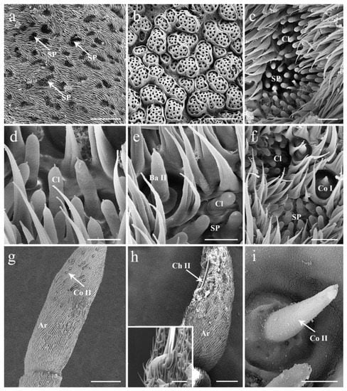 The postpedicel (1.56–1.91 mm in female, 1.64–1.86 mm in male) is the most prominent part possessing numerous and diverse sensilla. It can be divided into three aspects: the anterodorsal surface (Ad), the dorsolateral surface (with arista) (Dl), and the posteroventral surface (Pv) (Figure 1b,c). In total, four types of sensilla are detected in both sexes (Figure 2, Figure 3 and Figure 4), including trichoid sensilla (Tr) (Figure 2a,c), basiconic sensilla (Ba) (Figure 2a,b,d,e), coeloconic sensilla (Co) (Figure 2a,f), and clavate sensilla (Cl) (Figure 2b,g and Figure 3c–f). A large number of sensory pits (SP) are observed on the surface (Figure 3a,c,d). The microtrichia on the postpedicel are flat and grooved (Figure 2 and Figure 3e), with multiple micropores basally (Figure 2e,g and Figure 3e). The arista (Ar) is attached to the dorsolateral surface of the postpedicel (Figure 1a–c). It consists of a short basal and a long distal segment that are ornamented with short hair-like microtrichia. A set of coeloconic sensilla II (Co II) (Figure 3g,i) and a chaetic sensillum II (Ch II) (Figure 1c and Figure 3h) are located on the basal part of the distal segment. Ch II possesses an obvious basal bulb, without distinct cuticular grooves.
