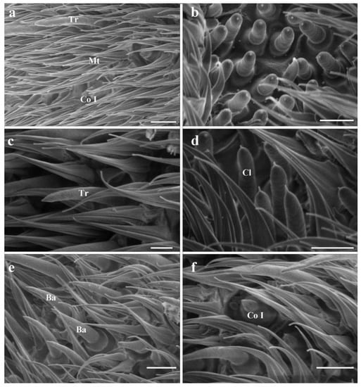 Clavate sensilla (Cl) are the most numerous sensilla in G. rhinocerontis. They are featured by subapical dilatation or swelling, giving them a club-like or spatulate appearance (Figure 2b–g, Figure 3c–f and Figure 4, Table 1). Every clavate sensillum arises from a swollen bulb, decorated with a rather abrupt tip on the top, and penetrated by a large number of pores on the cuticle. Clavate sensilla are detected mainly in sensory pits, while only a few of them are singly distributed in a superficial cavity on the surface of the postpedicel (Figure 2g and Figure 3c,d).