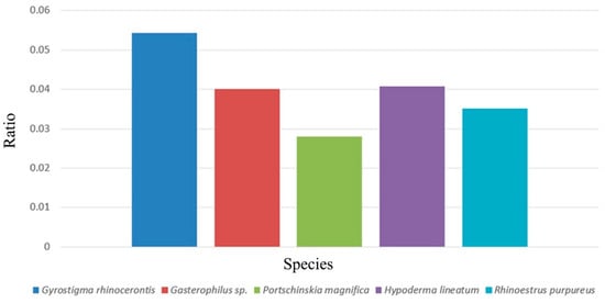 Length ratio of postpedicel and body (ratio = length of postpedicel/length of body) in G. rhinocerontis, Gasterophilus species, Portschinskia magnifica, Hypoderma lineatum, and Rhinoestrus purpureus (using modified data from [,,,,]).