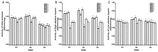 The larvae were dissected on ice and washed with 0.15 mol/L NaCl solution. The midgut and contents of the 2nd, 3rd and 4th instar larvae were harvested and placed in NaCl solution and homogenized in an ice bath. The homogenate was centrifuged at 12,000 rpm for 5 min at 4 °C, and the supernatant was used as the midgut enzyme extract for detection. The total soluble protein content in the enzyme solution was determined by 2-D Quant Kit [,]. The activity of each protease was determined according to the method of Zhao et al. []. The activities of total protease, high-alkaline trypsin and low-alkaline trypsin were measured at wavelengths of 415 nm, 405 nm and 247 nm using AZOCASEIN (Sigma Chemical Co., St. Louis, MO, USA), BAPNA (Nα-Benzoyl-DL-argininep-nitroanilide) (Sigma Chemical Co., St. Louis, MO, USA) and TAME (Nα-P-Tosyl-L-arginine methyl ester hydrochloride) (Sigma Chemical Co., St. Louis, MO, USA), respectively.