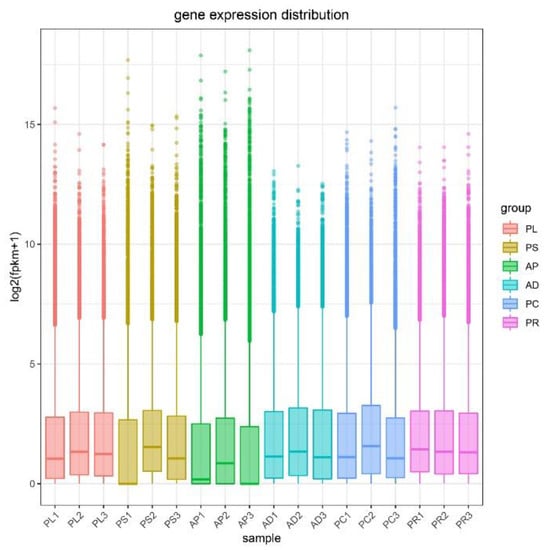 Gene expression distribution boxplot of each sample. The X-coordinate is the sample name, and the Y-coordinate is log2 (FPKM+1). The box plot for each region has 5 statistics (maximum, upper quartile, median, lower quartile, and minimum, respectively). Abbreviations: AD = artificial diet, AP = apples, PR = pears, PL = plums, PC = peaches and PS = peach shoots.