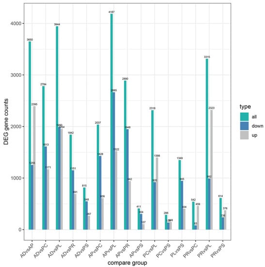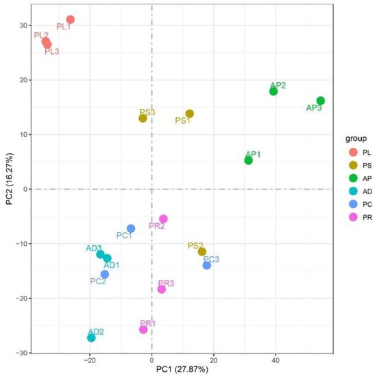 FPKM was used to correct the sequencing depth and gene length. The gene expression levels of different hosts were compared by analyzing the boxplot of gene expression level distribution, the FPKM density distribution and the violin plot of FPKM distribution. The FPKM of insects feeding on different hosts can be analyzed statistically and qualitatively from the genetic height and overall level. The results showed that the density and number of genes were in general basically similar (Figure 2, Figures S1 and S2). The correlation coefficients (R2) of samples within and between groups were calculated according to the FPKM values of all genes in each sample. It was found that the R2 of AD, PC, PR and PL were all greater than 0.83, and even that for PL was greater than 0.93, indicating good biological repetition among different hosts. However, the R2 between PS and AP were slightly lower (0.671–0.815), which may be that the adaptability of insects to hosts is different due to the difference in hosts, and also by incomplete cleaning of impurities in sample processing or mechanical errors in instrument operation (Figure S3). Principal component analysis (PCA) was used to assess inter-group differences and intra-group repeatability by dimensionality reduction and principal component extraction of a large number of genetic variables. A linear algebra calculation method was adopted to compare the similarity of the main components of feeding different hosts, and the differences in multiple groups of data were reflected by a 2-dimensional coordinate graph (Figure 3). In the scatterplot, the X-coordinate PC1 explained 27.87% of the variation in the data, while the Y-coordinate PC2 explained 16.27% of the variation. As shown in the figure, each host sample occasionally intersects slightly but is basically clustered separately.