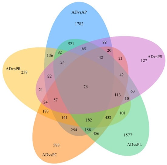 Venn diagram of gene numbers and distribution of 5 different hosts pairwise compared with AD.