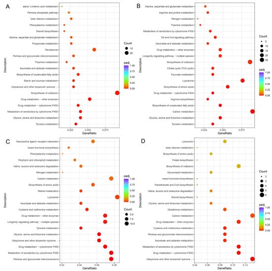 KEGG enrichment scatter plots of DEGs. (A). Up-regulated KEGG enrichment pathways of DEGs pairwise of AD vs. PL. (B). Up-regulated KEGG enrichment pathways of DEGs pairwise of PR vs. PL. (C). Down-regulated KEGG enrichment pathways of DEGs pairwise of PL vs. PS. (D). Down-regulated KEGG enrichment pathways of DEGs pairwise of PR vs. PS.