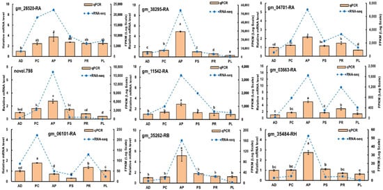 Quantitative real-time PCR was performed to validate 9 genes obtained from RNA-sequencing data (Gene IDs were gm_26520-RA, gm_38295-RA, gm_04701-RA, novel.798, gm_11542-RA, gm_03663-RA, gm_06101-RA, gm_35262-RB and gm_35484-RH). As expected, qRT-PCR and RNA-sequencing analyses of these 9 genes showed similar differential expression patterns, proving the reliability of our data and analyses (Figure 9).