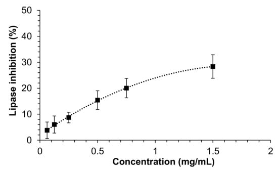 Effect of mealworm extract (mg/mL) on the inhibition (%) of pancreatic lipase enzyme under simulated intestinal conditions. Each data point corresponds to mean values ± SD, n = 3 independent experiments.
