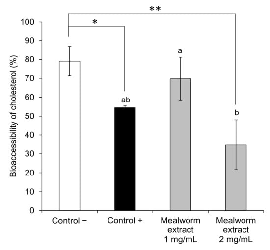 Bioaccessibility of cholesterol (%) after the gastrointestinal digestion of cholesterol in the absence (control –) and presence of inhibitors: β-sitosterol, as control + (at 1 mg/mL) and mealworm extract at 1 and 2 mg/mL. Bars are significantly different to control – when p = 0.014 (*) and p = 0.009 (**). Mean values with different letters (a−c) among inhibitors are significantly different if p ≤ 0.05.