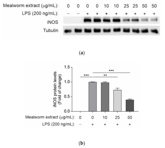 Inflammation is a common cellular response in many diseases, as well as a defense response against pathogens. In particular, the chronic inflammation of the central nervous system (CNS) was related to peripheral metabolic alterations including those associated with obesity, insulin resistance and type 2 diabetes [39,40]. Therefore, the ability of the mealworm extract to counteract LPS-mediated proinflammatory effects in resident macrophages of the CNS was investigated in immortalized murine microglial cells. For this goal, cells were pretreated for 2 h with the mealworm extract at doses of 10, 25 and 50 µg/mL, after which LPS (200 ng/mL) was added to the culture dishes for a further 16 h. As controls, the cells were treated with LPS or the mealworm extract alone. At the end of the culture time, the pro-inflammatory response of the microglial cells was evaluated by analyzing the protein expression levels of iNOS. As shown in Figure 3, the mealworm extract was effective in decreasing the iNOS levels, as its anti-inflammatory effect is statistically significant at 25 and 50 µg/mL. These results strongly suggest that the mealworm insect extract might protect against neuroinflammation associated with obesity and type 2 diabetes. Evidence of non-protein extracts similar to that of the current assay has not been found, since most previous studies have focused on the major protein fraction. Thus, protein from mealworm larvae has been shown to markedly inhibit the production of NO without cytotoxicity in LPS-stimulated raw 264.7 macrophage cells and to reduce the expression level of cyclooxygenase-2 (COX-2) and iNOS protein through the regulation of mitogen-activated protein kinases (MAPKs) and nuclear factor kappa B [41]. Additionally, in LPS-induced RAW 264.7 cells, a mealworm water extract was demonstrated to decrease the production of NO in a dose-dependent manner, as well as reduce the expression of iNOS. Consequently, the protein levels of prostaglandin E2 (PGE2), iNOS, COX-2 and MARKs were significantly reduced [42].