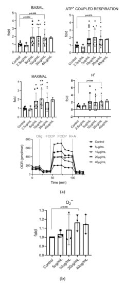 We then analyzed the levels of mitochondrial superoxide (O2−) production (Figure 4). Under basal conditions, it is estimated that approximately 1–5% of the oxygen consumed by the cell is converted into reactive oxygen species (ROS) due to the escape of electrons from the ETC, which, when reacting with oxygen, produces a superoxide anion. Mitochondrial ROS production can increase under conditions of cellular stress. In response to extract treatment, we observed a non-significant increase in O2− levels that could be related to the non-significant increase in H+-leak. This observation is also consistent with the higher observed OCRs rates.