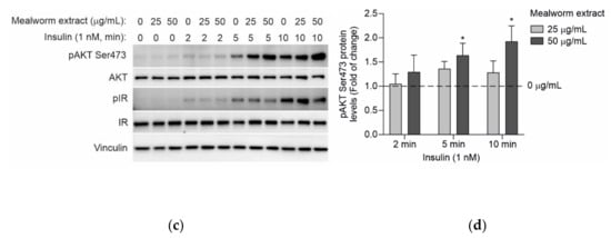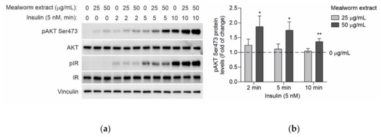 We investigated the effect of the mealworm extract on the insulin-mediated signaling cascade as a molecular readout to evaluate insulin sensitivity. To achieve this, we chose primary mouse hepatocytes due to their key role in insulin metabolic actions including the suppression of hepatic gluconeogenesis [44]. Primary mouse hepatocytes, cultured as described in the Materials and Methods, were pretreated for 24 h with the mealworm extract used at 25 and 50 µg/mL in serum-free DMEM medium (5.5 mM glucose). Then, the cells were further stimulated with 5 or 1 nM insulin for several time-periods (2, 5 and 10 min), after which the early steps of the insulin signaling cascade were analyzed. As shown in Figure 5, the insulin rapidly increased the phosphorylation of the insulin receptor (IR), as well as the phosphorylation of its downstream mediator AKT (also known as protein kinase B). Interestingly, the mealworm extract used at 50 µg/mL showed a statistically significant effect in enhancing insulin-mediated AKT phosphorylation in a time-dependent manner without affecting the phosphorylation of IR. The significant enhancement of insulin-mediated AKT phosphorylation by 50 µg/mL of the mealworm extract was observed when insulin was used at 5 nM as well as at 1 nM, a very low insulin concentration, evidencing the potent effect of the extract in enhancing the insulin sensitivity in hepatocytes. At the molecular level, these results highlight that the beneficial effects of the mealworm extract in potentiating AKT phosphorylation in primary mouse hepatocytes are elicited downstream of the IR. In agreement, this effect was also observed in diabetic C57BL/Ksj-db/db mice supplemented with an aqueous ethanol mealworm extract, similarly to that used in the current study, which significantly stimulated the phosphorylation of insulin receptor substrate-1 and AKT, as well as the activation of phosphatidylinositol 3-kinase in the insulin signaling pathway of skeletal muscles [45].