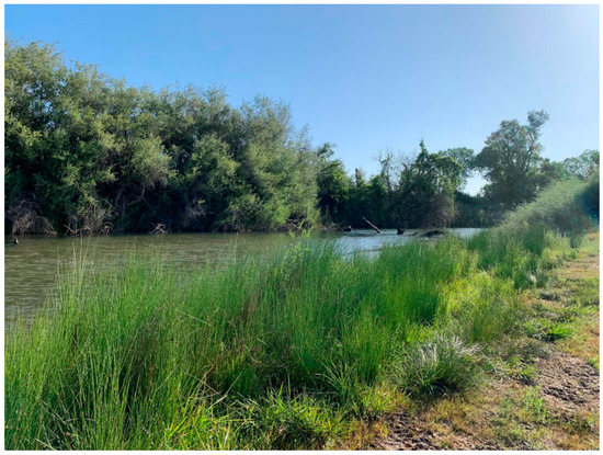 The riverbed consists mostly of sand with fine silt and mud along the banks. The water at the sampling site was clear. The predominant submerged aquatic vegetation consisted of Canadian waterweed (Elodea canadensis) along the banks and dense masses of the moss Fontinalis hypnoides attached to submerged logs. Simuliid larvae and pupae attached to both of these plants. Additional submerged vegetation in the area, but to which simuliids did not attach, included coontail (Ceratophyllum demersum) and filamentous algae. The riparian zone consisted mostly of sandbar willow (Salix exigua), river bulrush (Scirpus fluviatilus), and annual beardgrass (Polypogon monspeliensis) along the banks, with valley oak (Quercus lobata) and Fremont poplar (Populus fremontii) further upland. Canopy cover at the collection site was 0%, with approximately 25–50% canopy cover 50 m upstream.