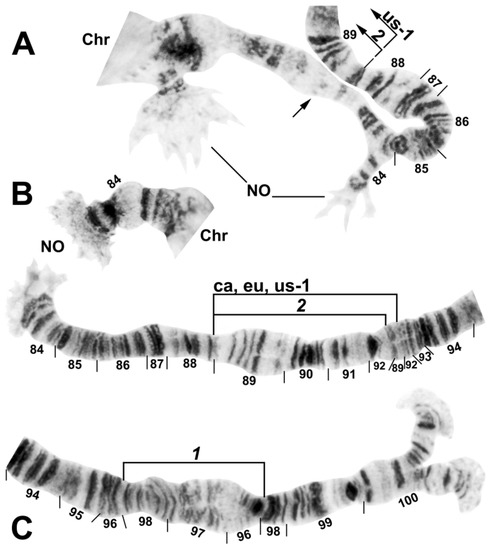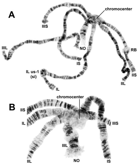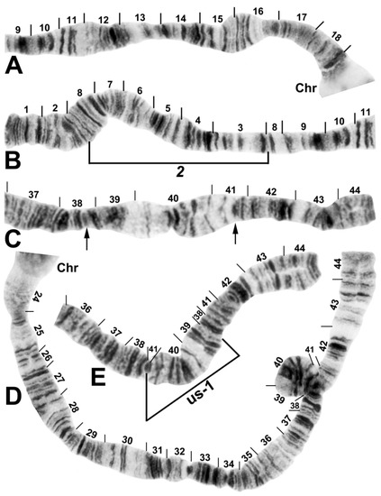 - Zhimulev, I.F.; Belyaeva, E.S.; Semeshin, V.F.; Koryakov, D.E.; Demakov, S.A.; Demakova, O.V.; Pokholkova, G.V.; Andreyeva, E.N. Polytene chromosomes: 70 years of genetic research. Int. Rev. Cytol. 2004, 241, 203–275. [Google Scholar] [CrossRef]
