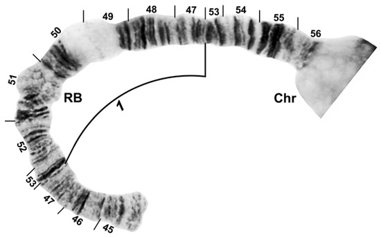 Chromosome arm IIS of Simulium ustulatum n. sp. (female larva), showing the IIS-1 fixed sequence; Chr, chromocenter; RB, ring of Balbiani.