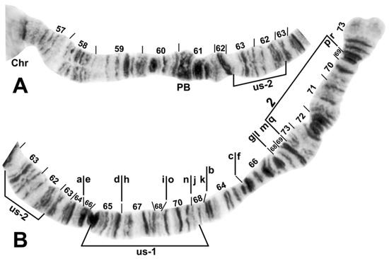 Chromosome arm IIL of Simulium ustulatum n. sp. (female larva). (A) Basal portion of arm, showing the homozygous IIL us-2 sequence; Chr, chromocenter; PB, parabalbiani marker. (B) Distal portion of arm, showing the complexly rearranged fixed sequence hypothesized to consist of 7 inversions, including the simple subterminal IIL-2 inversion. Vertical bars above the chromosome indicate all fixed-inversion breakpoints. Alphabetizing the letters a–r produces the standard sequence for the S. annulus group. Two autosomal polymorphisms are indicated: The IIL us-2 sequence is present homozygously (bracketed), whereas the IIL us-1 sequence is not present, but its limits are bracketed.