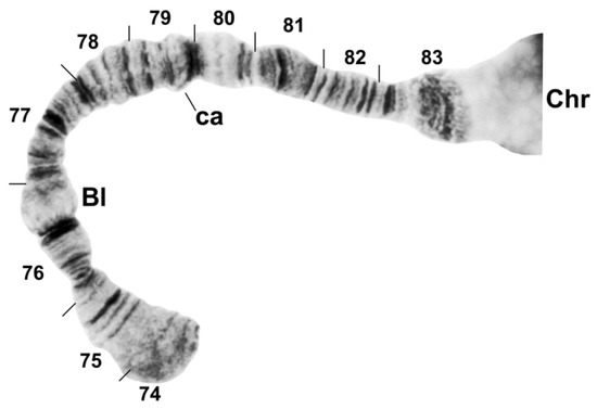Chromosome arm IIIS of Simulium ustulatum n. sp. (female larva), showing the standard sequence for the S. annulus group. Bl, blister marker; ca, capsule marker; Chr, chromocenter.
