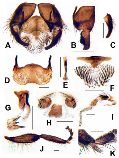 Male of Simulium ustulatum n. sp.; all scale bars = 0.1 mm. (A) Genitalia, ventral view. (B) Gonopod, lateral view. (C) Gonostylus, slight ventrolateral view. (D) Ventral plate, ventral view. (E) Median sclerite. (F) Dorsal plate and aedeagal membrane with spines. (G) Paramere and parameral spines. (H) Tergite X and cerci. (I) Maxillary palp, showing 5 palpomeres, and lacinia. (J) Hind tibia, tarsus, and acropod with claws. (K) Apex of basitarsus showing the calcipala, and first tarsomere showing the pedisulcus.