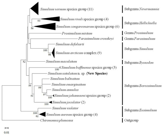 COI sequences with higher than 85% identity with known North America species in the BLAST search were selected for relationship analysis. Multiple sequence alignment using the MUSCLE algorithm and phylogenetic tree estimation using the Neighbor-Joining method [28] and Kimura 2-parameter model [29] were performed in MEGA 11 [30]. GenBank accession numbers for sequences used in the analysis were as follows: Chironomus plumosus: KX781763.1; Parasimulium crosskeyi: FJ524493.1; Prosimulium mixtum: KR515236.1; Simulium aestivum: FJ524569.1, FJ524570.1; S. anatinum: FJ524579.1; S. annulus: JF872769.1; S. apricarium: JF815152.1, JF815165.1, KJ662698.1, KM497540.1; S. arcticum: KJ662678.1, KJ662813.1, KM497546.1; S. baffinense: JF872771.1, FJ524582.1; S. balteatum: FJ524591.1; S. bracteatum: HM374133.1, MG158956.1; S. brevicercum: KJ662791.1, KM497568.1; S. carbunculum: FJ524632.1; S. congareenarum: JF877007.1; S. conicum: FJ524638.1, FJ524639.1; S. croxtoni: FJ524654.1, KR671377.1; S. curriei: FJ524662.1, KR679937.1; S. defoliarti: JF868187.1; S. emarginatum: FJ524682.1; S. excisum: JF878006.1, KR753727.1; S. exulatum: JF877228.1, KR664724.1; S. gouldingi: FJ524701.1, HQ552022.1; S. joculator: FJ524722.1, FJ524728.1; S. johannseni: FJ524730.1, FJ524732.1; S. maculatum: NC 040120.1; S. nebulosum: KR444287.1, MG156442.1, MG159025.1; S. pugetense: FJ524763.1; S. silvestre: JF872847.1; S. usovae: JF872758.1; S. ustulatum n. sp.: OP256416; S. violator: KR646048.1.