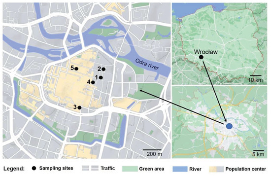 Location map of investigation area in the center of Wrocław: sampling sites: (1) 5 Kotlarska St., (2) 2–4 Jodłowa St., (3) 78–80 Szewska St., (4) Łaciarska St. (backyard), (5) 21 Kotlarska St.