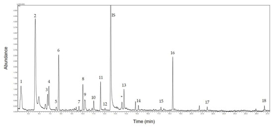 The analysis of volatiles from the sample was performed by headspace analysis from fresh flowers using gas chromatography coupled with mass spectrometry (HS-GC/MS). The obtained chromatogram is presented in Figure 2.