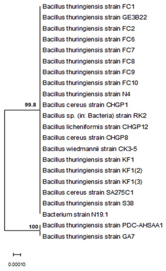 - Selvakumar, G.; Mohan, M.; Sushil, S.N.; Kundu, S.; Bhatt, J.C.; Gupta, H.S. Characterization and phylogenetic analysis of an entomopathogenic Bacillus cereus strain WGPSB-2 (MTCC7182) isolated from white grub Anomala dimidiata (Coleoptera: Scarabaeidae). Biocontrol Sci. Technol. 2007, 17, 525–534. [Google Scholar] [CrossRef]