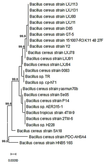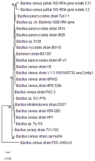 Twenty soil samples were collected from date palm rhizosphere in Al Ahsa Oasis, Saudi Arabia. In order to grow bacterial isolates, a soil solution from each sample was well mixed by vortexing, and one loop was placed on nutrient agar (BD Difco™, BD Biosciences, Franklin Lakes, NJ, USA) plates (90 mm Ø) for further investigation. Incubation at 30 °C for 48 h was followed by storage at 4 °C until they were needed. For further isolation and to prevent the presence of background flora, individual colonies were picked up and resealed on new nutrient agar plates. The streaking process was repeated at least five times. Nutrient agar slants were used to cultivate 23 unidentified and purified bacterial strains. The 16S ribosomal DNA universal primers were used to identify the isolates [31]. PCR was performed as explained by Elsharkawy et al. [31]. Samples were properly prepared for dye terminator cycle sequencing using the BigDye Ready Reaction kit (Applied Biosystems, Foster City, CA, USA). The PCR conditions were 3 min at 94 °C, 24 cycles of 30 s at 94 °C for 30 s at 54 °C and 1 min at 72 °C, and then, 10 min at 72 and held at 4 °C. Applied Biosystems Genetic Analyzer which was installed with a 50 cm capillary array was used to conduct DNA sequencing. Sequence scanner software (Applied Biosystems) was utilized to read the sequencing data, and then nucleotide alignment blast was utilized to blast the unidentified sequences online on GenBank’s DNA sequences database. Neighbor-joining (NJ) algorithms were used to create phylogenetic trees from the alignment of the sequences utilizing MEGA 11.0.1 software [32]. Bootstrap analysis with 1000 repetitions of the same software was used to assess the dendrogram’s reliability. There were three separate replicates of this experiment.