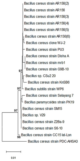Phylogenetic dendrogram showing the position of Bacillus cereus strain PDC-AHSA3 among phylogenetic neighbors.