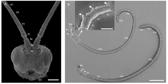 - Gao, Y.; Luo, L.-Z.; Hammond, A. Antennal morphology, structure and sensilla distribution in Microplitis pallidipes (Hymenoptera: Braconidae). Micron 2007, 38, 684–693. [Google Scholar] [CrossRef] [PubMed]