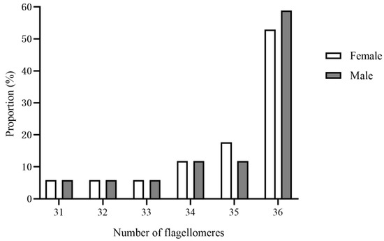 Proportion of total number of antennal flagellomeres in female and male C. qinlingensis (n = 34).