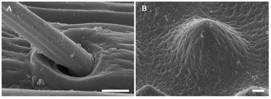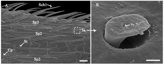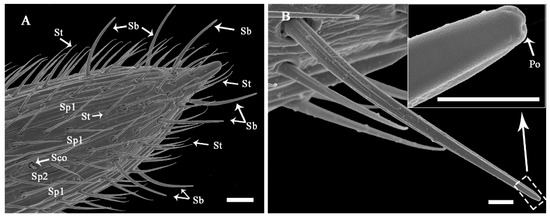 Sb are ribbed pegs that project slightly more perpendicular to the antennae than St and Sch described above (Figure 7A; Table 2). They range from 23.56 to 35.35 μm in length and 2.07 to 4.10 μm in basal width. The stem of these sensilla gradually curves at the 1/3 position. They end with a blunt tip, where 2-3 pores are located. Sb emerge from a flexible cuticular socket (Figure 7B). These sensilla are usually located at the distal part of every flagellomere (Figure 7A and Figure 8A,B).
